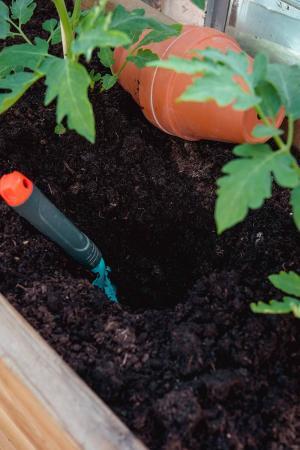- Die Ollas können jetzt in den Beeten vergraben werden, sie sollten dabei ca. 2cm aus der Erde ragen. Am besten platzierst du sie zwischen 2-3 Pflanzen, achte beim Eingraben darauf, dass du die Wurzeln der Pflanzen nicht beschädigst.