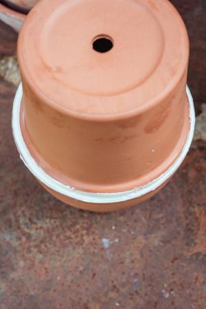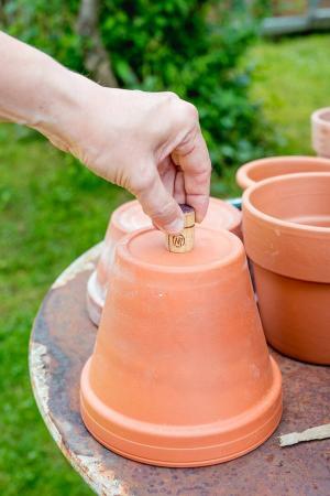 - Zunächst muss bei einem der Tontöpfe das Abflussloch wasserdicht verschlossen werden. Dazu gibt es mehrere Möglichkeiten:Am einfachsten ist es einen Wein- oder Sektkorken in das Loch zu stecken. Falls der Korken nicht passt, kannst du ihn mit einem scharfen Messer passend zuschnitzen.Du kannst das Loch aber auch mit Hilfe eines flachen Steines oder einer Tonscherbe abdichten. Dazu den Stein einfach über das Loch kleben.