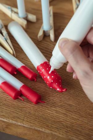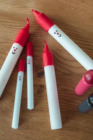 - Dekorieren/bemalen: Wenn die Kerzen vollständig ausgehärtet sind, kannst du sie nach Belieben weiter dekorieren und mit Kerzenstiften Punkte oder ein Gesicht aufmalen.