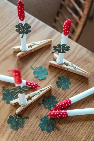 - Ich habe zusätzlich Kleeblätter ausgeschnitten (mit meinem Plotter) und diese mit Draht an den Kerzen befestigt. Außerdem habe ich auf Wasserschiebefolie "Glückskerze" gedruckt und diese anschließend auf die Wäscheklammern übertragen. Du kannst natürlich auch mit wasserfestem Stift etwas Individuelles auf die Klammern schreiben.