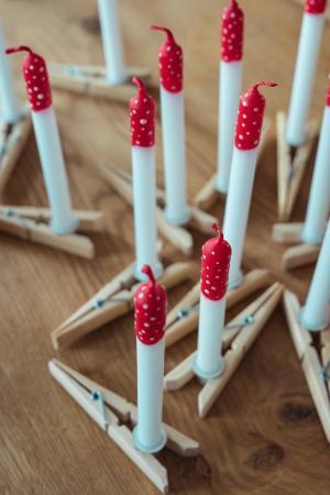 - Materialien vorbereiten: Du benötigst weiße Stabkerzen, Kerzen zum einschmelzen, Wachsmalstoffe/Wachsstifte (in verschiedenen Weihnachtsfarben), Kerzenmalstifte, einen Topf oder Behälter zum Schmelzen des Wachses, einen Löffel zum Rühren sowie Wäscheklammern.